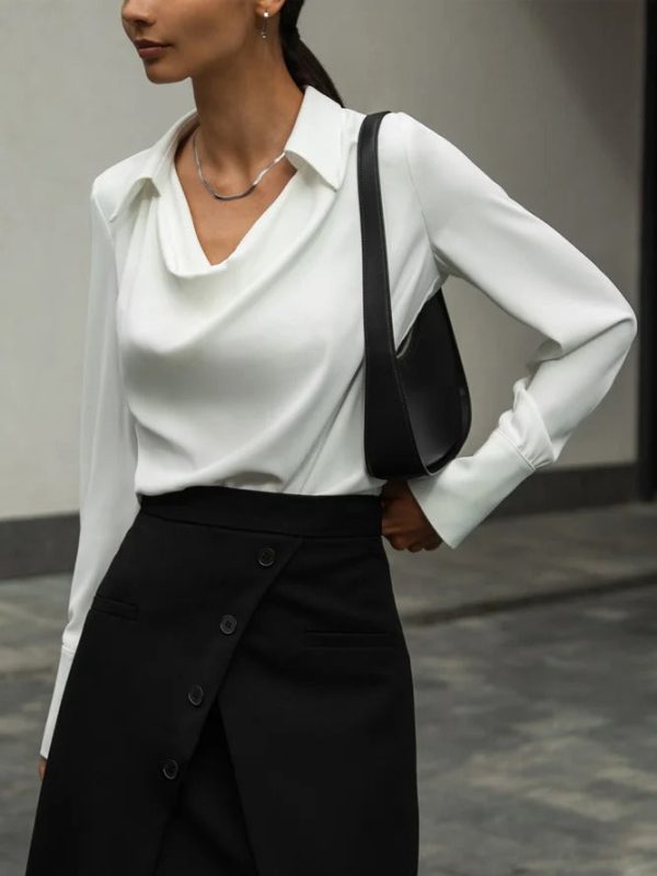 Cream White Cowl Neck Fold-Over Collar Blouse Top
