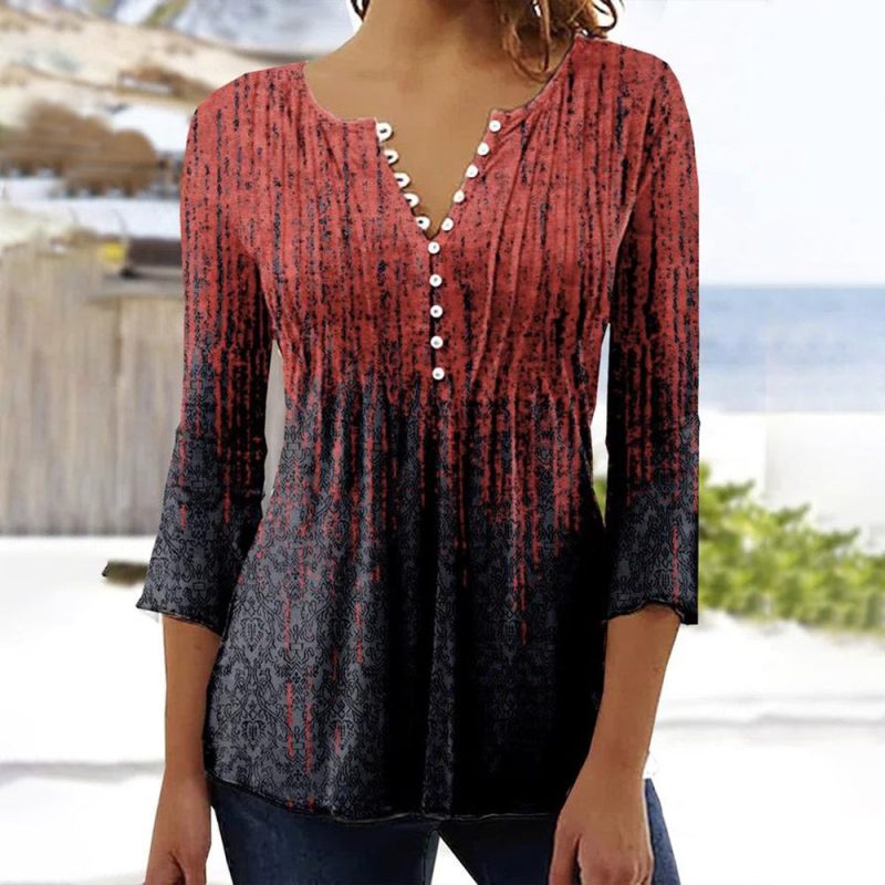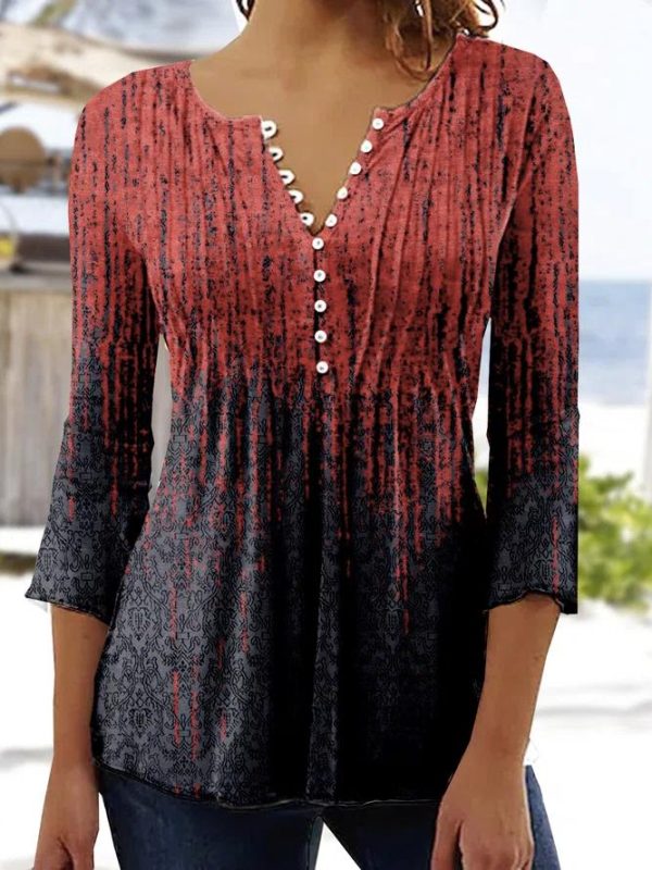 Ombre Red to Blue Pleated Button Front ¾ Sleeve Top